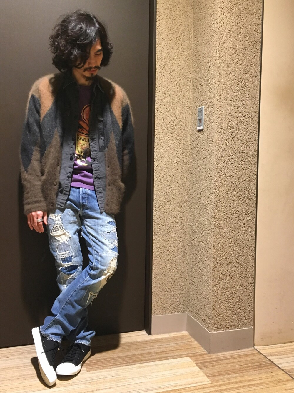 いつもご覧いただきありがとうございます! イイネ・SAVE・FOLLOW感謝です! 気づけば10月も最終日…暑かったり寒かったりと、服のチョイスが難しいですね。 今回のコーデは、秋らしい色使いを意識したロックテイストにしてみました🍁 上質なラクーン素材を使用したダイヤ柄のカーディガンは、かの有名なNIRVANAのKurt Cobainが着ていたようなグランジ感溢れるアイテムです。 ボロボロなリメイクデニムとスニーカーの鉄板な合わせで🎶 …猫背が今日も全開です🐈