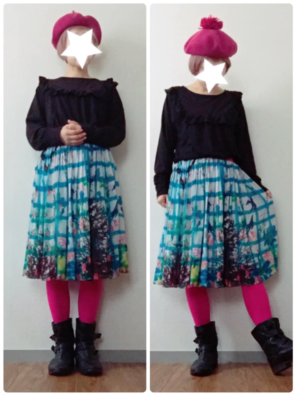 今日のコーデではないのですが😓 ツモリチサトのシルクのシフォンスカート、色がとっても綺麗なのです😍✨ ビビッドなピンクのタイツを合わせて、ハズしてみました🎀 これが黒いタイツだと、また全然雰囲気変わるからコーディネートって面白い。 イイね、フォローありがとうございます♥恐縮ですです🙇💦