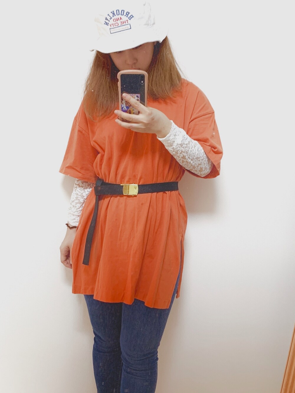 オレンジ系のTシャツ/カットソー、ブルー系のデニムパンツを着用したレディースの秋コーディネートの1枚目の写真