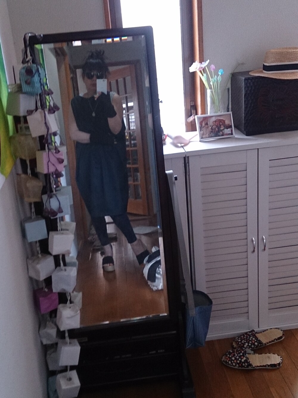 DOORS×mizuiroindコラボのネービーワンピース。金額は推定。シンプルなのに着やすいワンピース。インナーはYUKI TORIIのしわ加工、タックトップ。美しいブルー48000円。バッグはLOEWE。200000円くらいでフランスで購入。プラダのサングラスはいただきもの。38000円くらいだと思います。シンプルなコーデは暑い夏に快適。