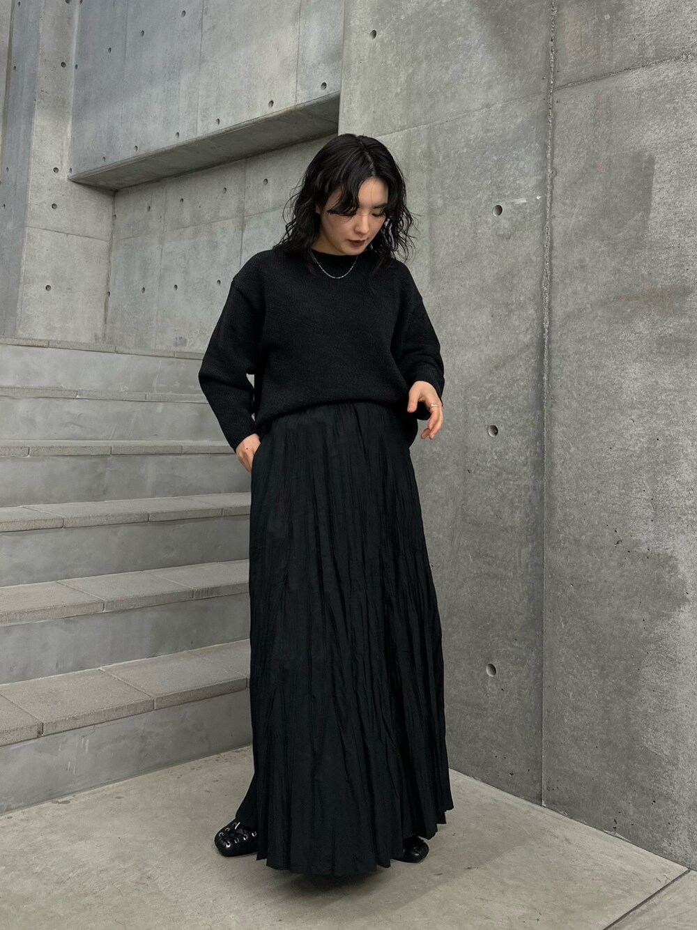 オールブラックでも、ふんわりと空気の含みのいいコットン素材がスタイリングに軽やかさをくれるナイスなスカート。丈はマキシ丈ですが、着ると意外とボリュームも膨らみすぎないので、低身長の方でも着られる印象なくスッキリと合わせていただけます。 ぜひお試しくださいませ。