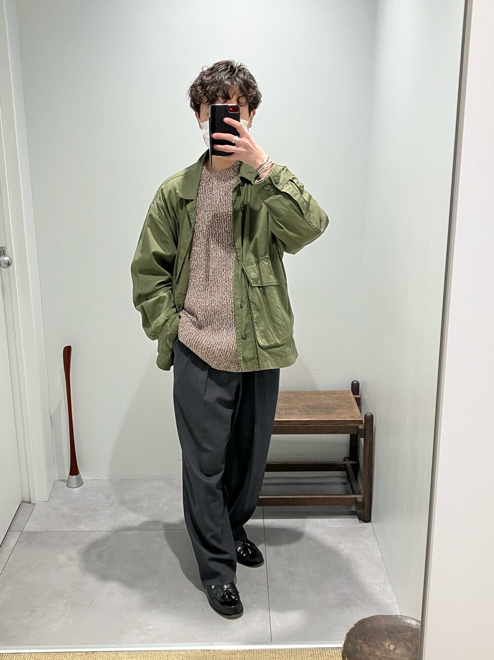 いつかの店頭コーデ✨ GOLDのミリタリージャケットにワイドスラックスを合わせたキレイめコーデでした ニットの編み柄が良い雰囲気出してくれてます^ ^