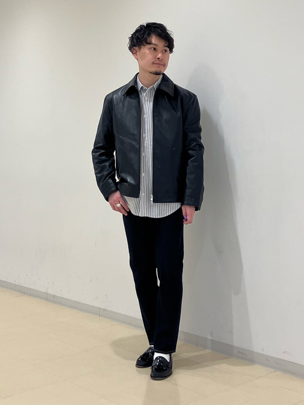 レザーのハリントンジャケットにリジッドのデニムを合わせたコーディネートです✨
