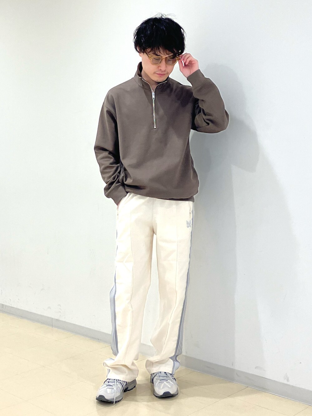 春の新作コーデ✨ ハーフジップのトップスに別注トラックパンツを合わせた休日のお出かけにオススメのコーデ^ ^