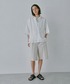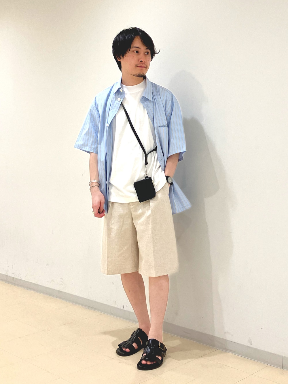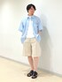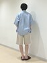 水色のストライプシャツをメインにきれいめなショートパンツを合わせた淡色コーデ✨