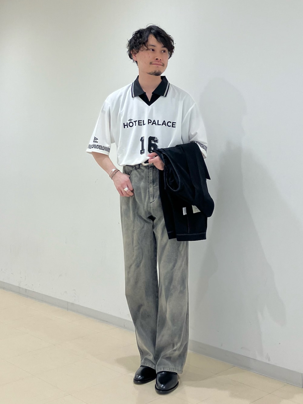 ゲームシャツにデニムを合わせたhotelpalaceコーデです✨ 手に持つのはジャケットで気温に合わせて着てもオシャレです。
