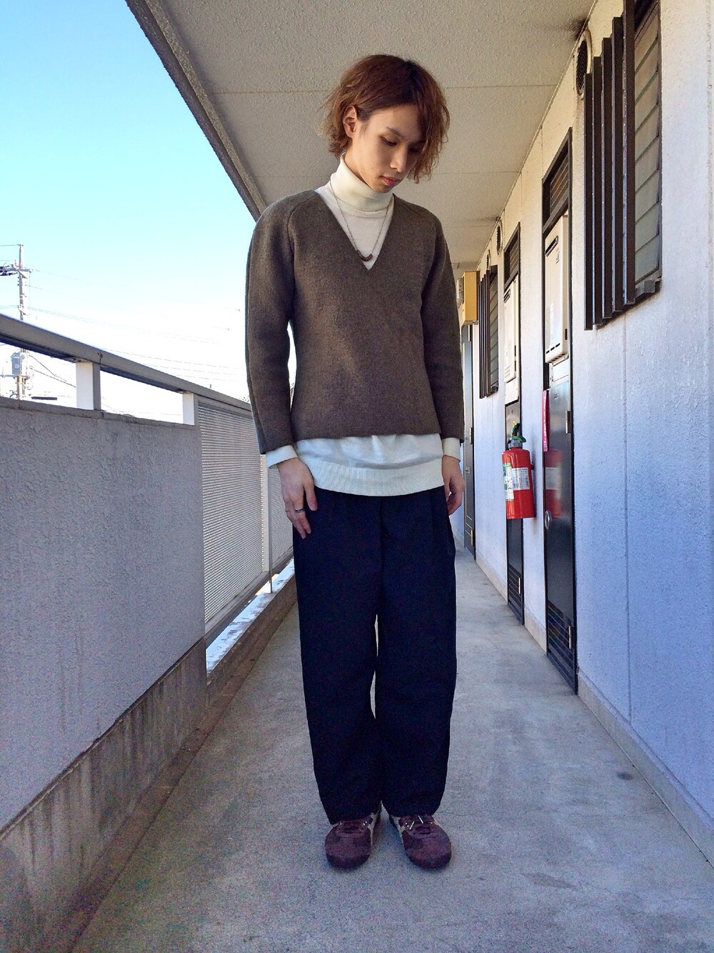 ワイドパンツのワイドさ伝わり辛いですね😂笑 上はニットオンニットで、タートルはUNIQLO、Vネックのは10 corso como COMMEdesGARCONS×Martin Margielaです。古着屋で見つけて買ったのですが、流石に⑥のSは着れなくはないけど小さい…のでちょっと無理してタイトに着てます。
