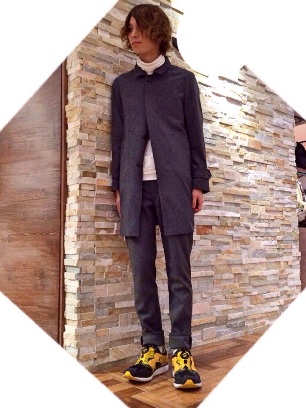 コートのボタンは1番上から数個をとめて下をちょい開け パンツと色を合わせてセットアップ風にしました!