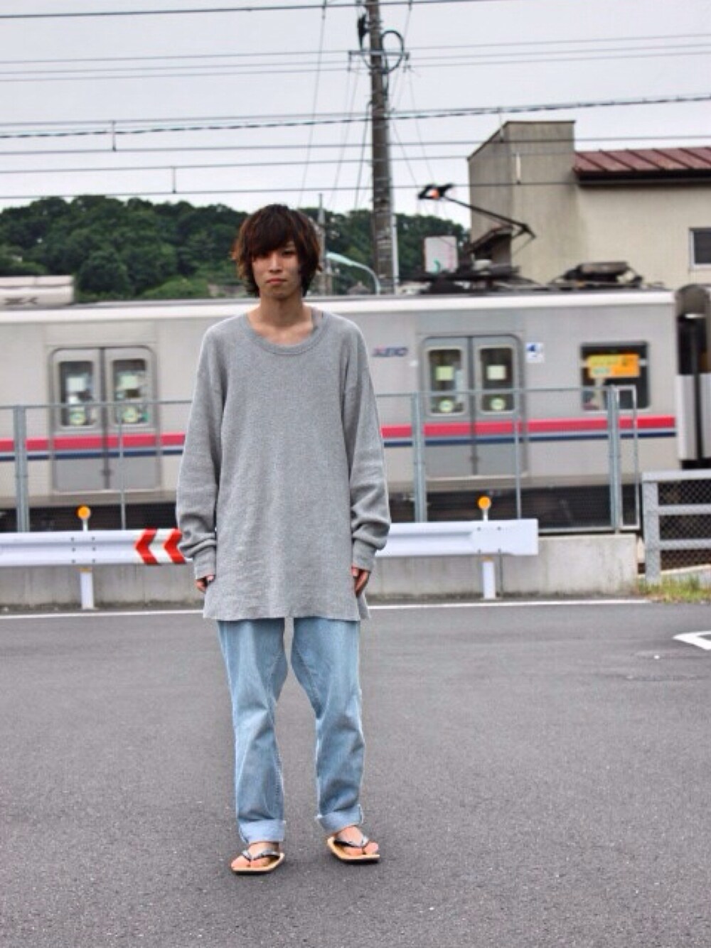にや顔 友人宅の近くで撮ってもらったのですが、ちょうど電車が! サーマルTもジーンズも大きめサイズの楽チンゆるコーデ ジーンズ×雪駄にハマりそうです😎