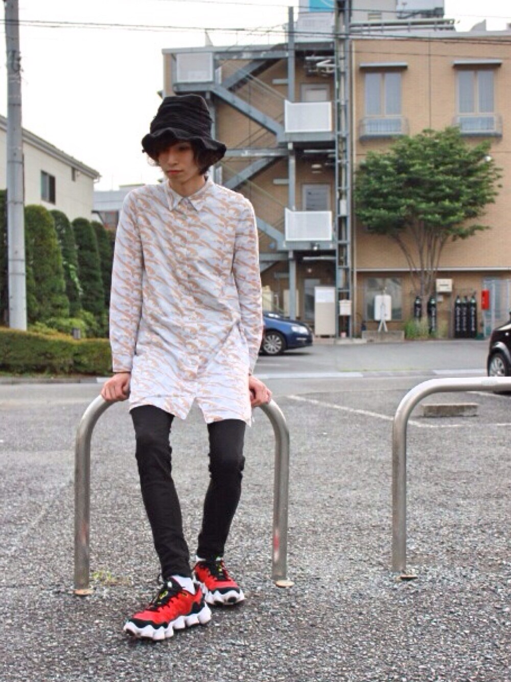 レッド系のスニーカー、ブラック系のハットを着用したメンズの夏コーディネートの1枚目の写真