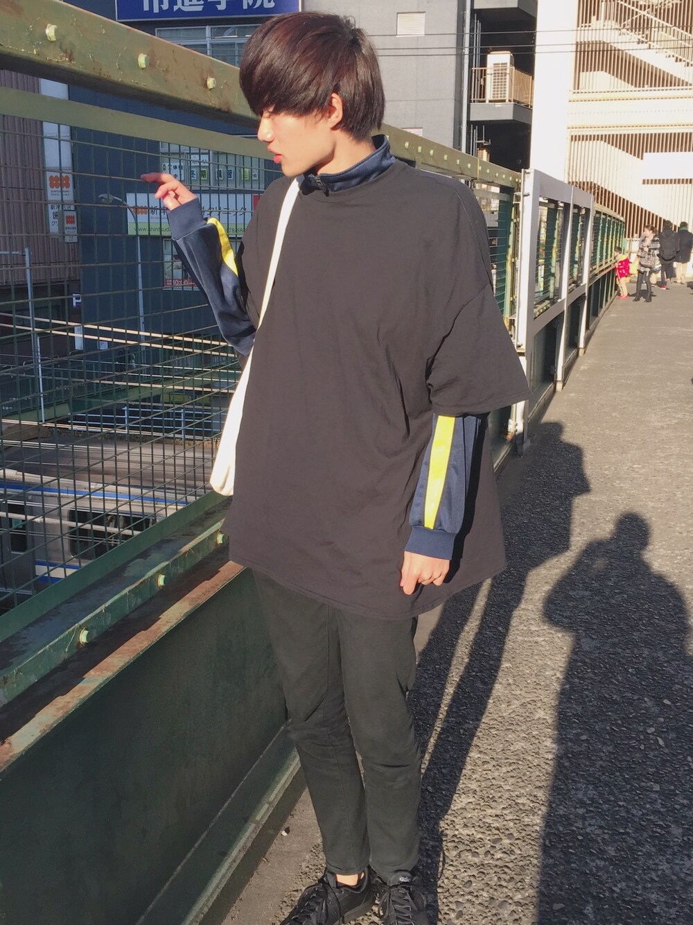 wear初投稿!今日は僕の好きなモードな雰囲気のコーデ。 黒の中にさし色をつけるのが最近の僕。 BIGTシャツにスポーツウェアーをミックスするスタイル。 周りに差をつけます! た・か・のstyle。