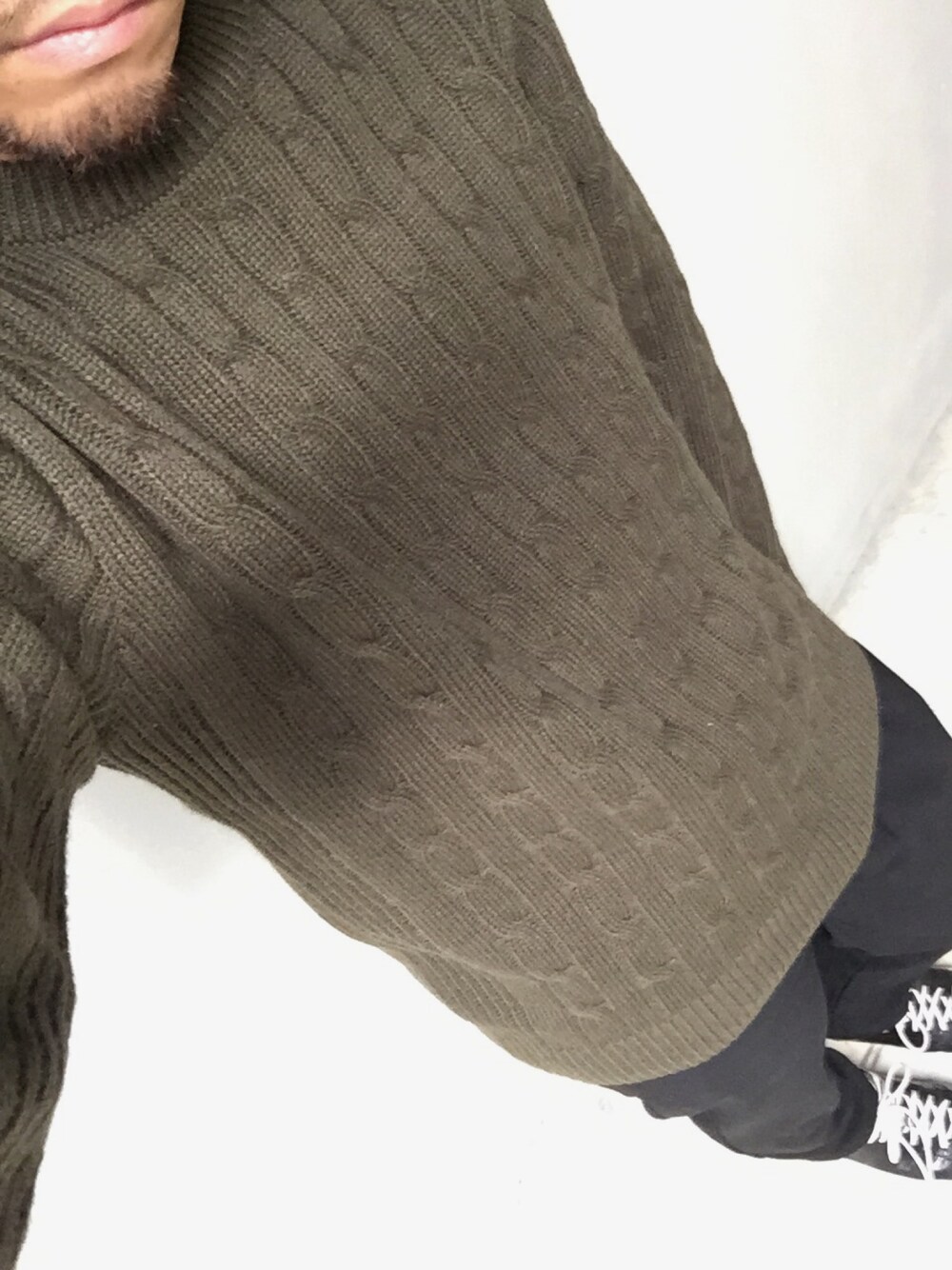 定番アイテムのケーブルセーターコーデ 秋をイメージしてアースカラーのカーキ 渋くていい色合い 着やすさ抜群