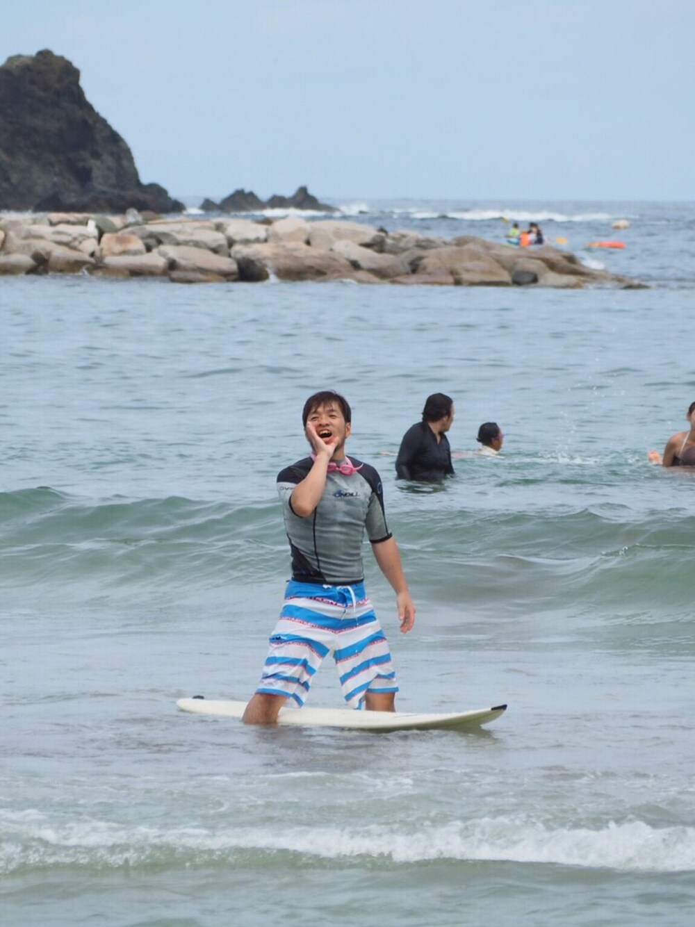 おーい行くぞ〜沖に〜〜 そうあんまり波無かったけど乗りました♡ 久しぶりやからそれでも満足♡♡ #何故か首に水中メガネwww #それまで子供遊んでたから忘れてた😂😂😂