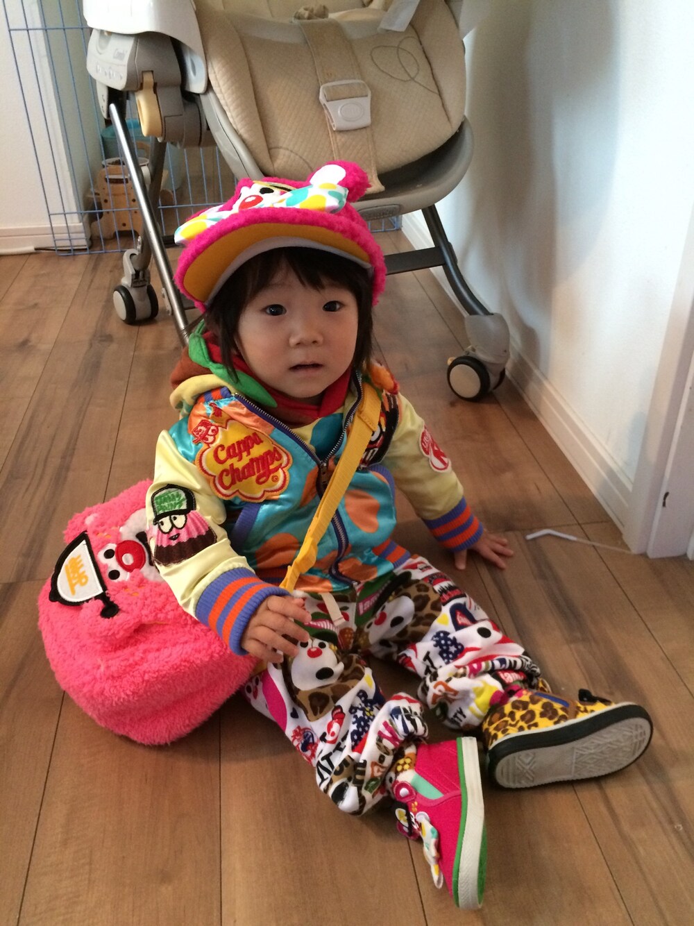 JAMならではの派手派手コーデです♡ バーガーのパーカーと、スカジャン、クマポケパンツがとても可愛いです(^_^*)♡カバンは大きいので、ヒモ部分を縫い付けてワッペンを貼ってます。