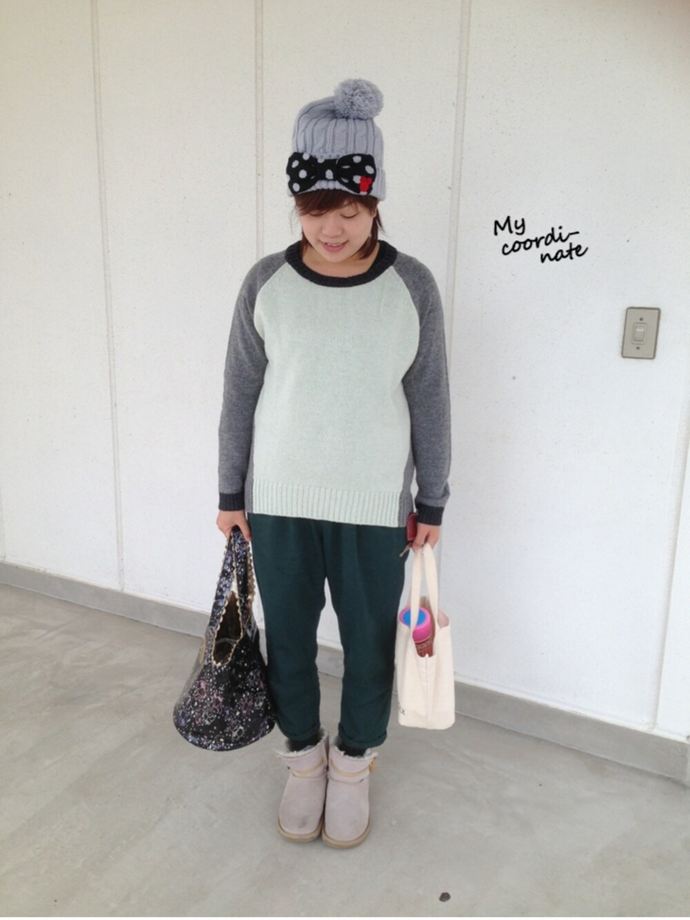 髪ボサボサね? パンツはよく登場してるパンツ。 結局履きやすいから、しょっちゅう履いちゃう。 ニット帽はディズニーで購入したやつ〜 髪ボサボサは見逃して? セーターはgu☆ ブローチでもつければよかったなー!