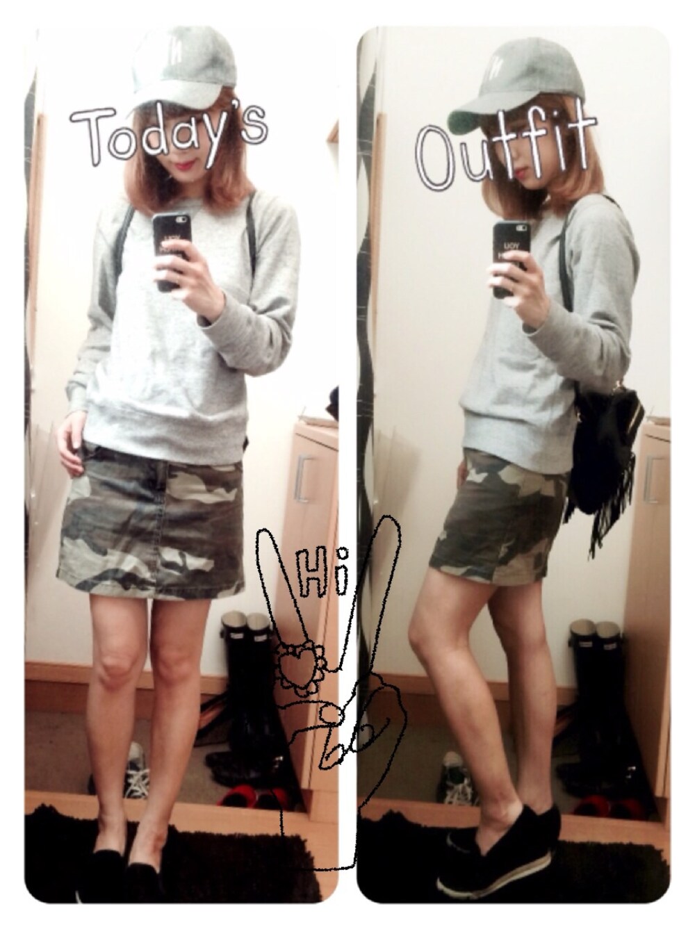 迷彩柄のミニスカートにUNIQLOのスウェット、ベースボールキャップでカジュアルスタイルですが足元はスニーカーではなくヒールで女性らしくしました。