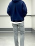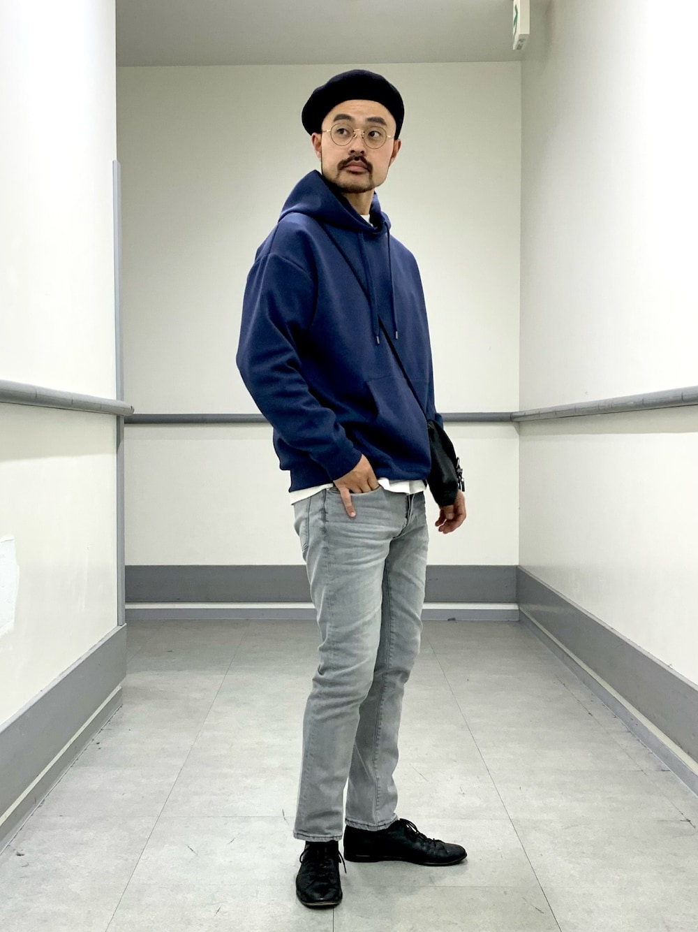 ネイビーブルーの鮮やかな色味のパーカーをモノトーンで引き立てました。