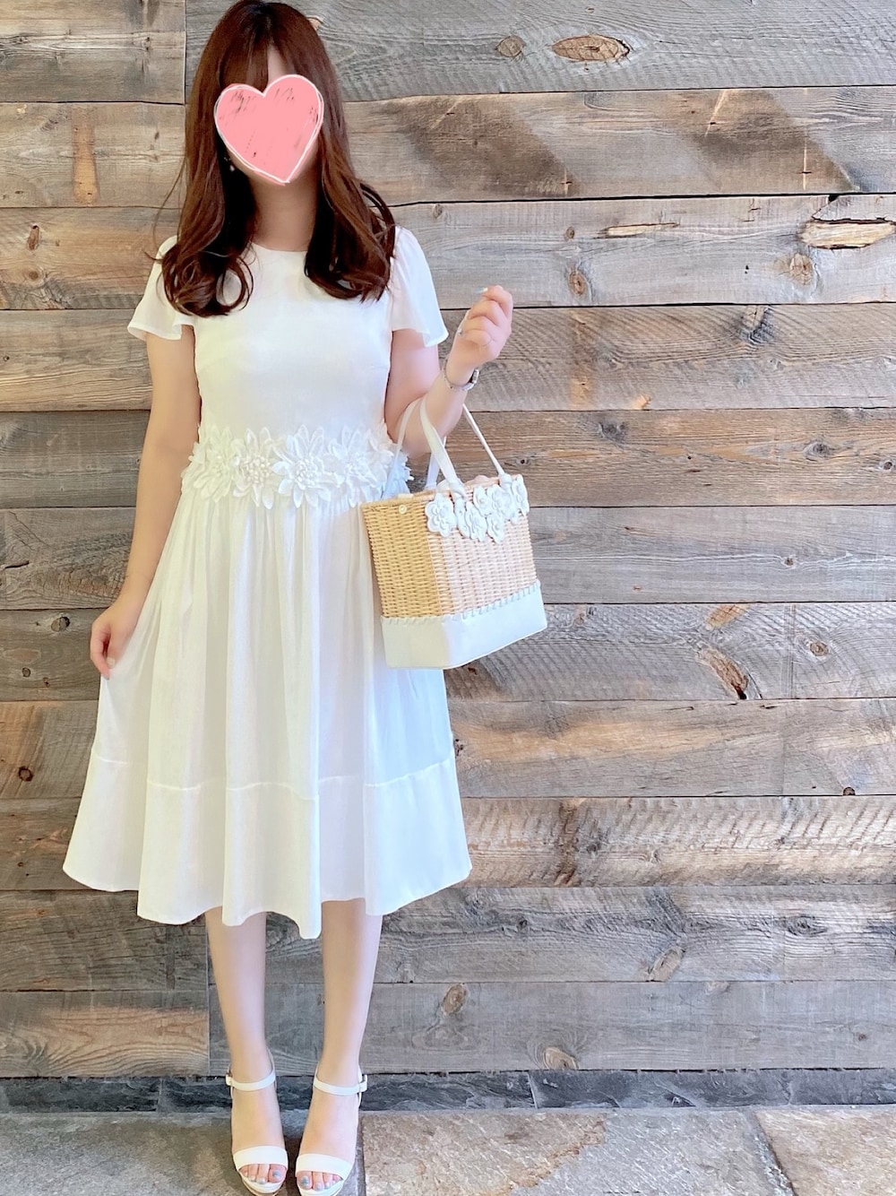 全身オールホワイトコーデ にしました✨ 夏が終わる前に着れてよかった☺️笑 前回載せたアイボリーとは違ってこちらは白の中でもオフホワイトで合わせているのでパステルサマー の方にお似合いになるコーディネートです❣️ ウエストマークのお花が高い位置にあるので脚長効果になる可愛いだけじゃないワンピースとなります✨