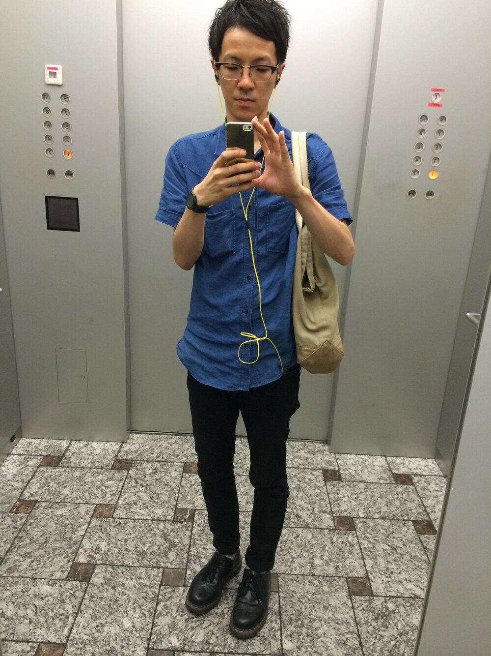 仕事帰り 会社のエレベーターにて こんな格好で仕事してます。