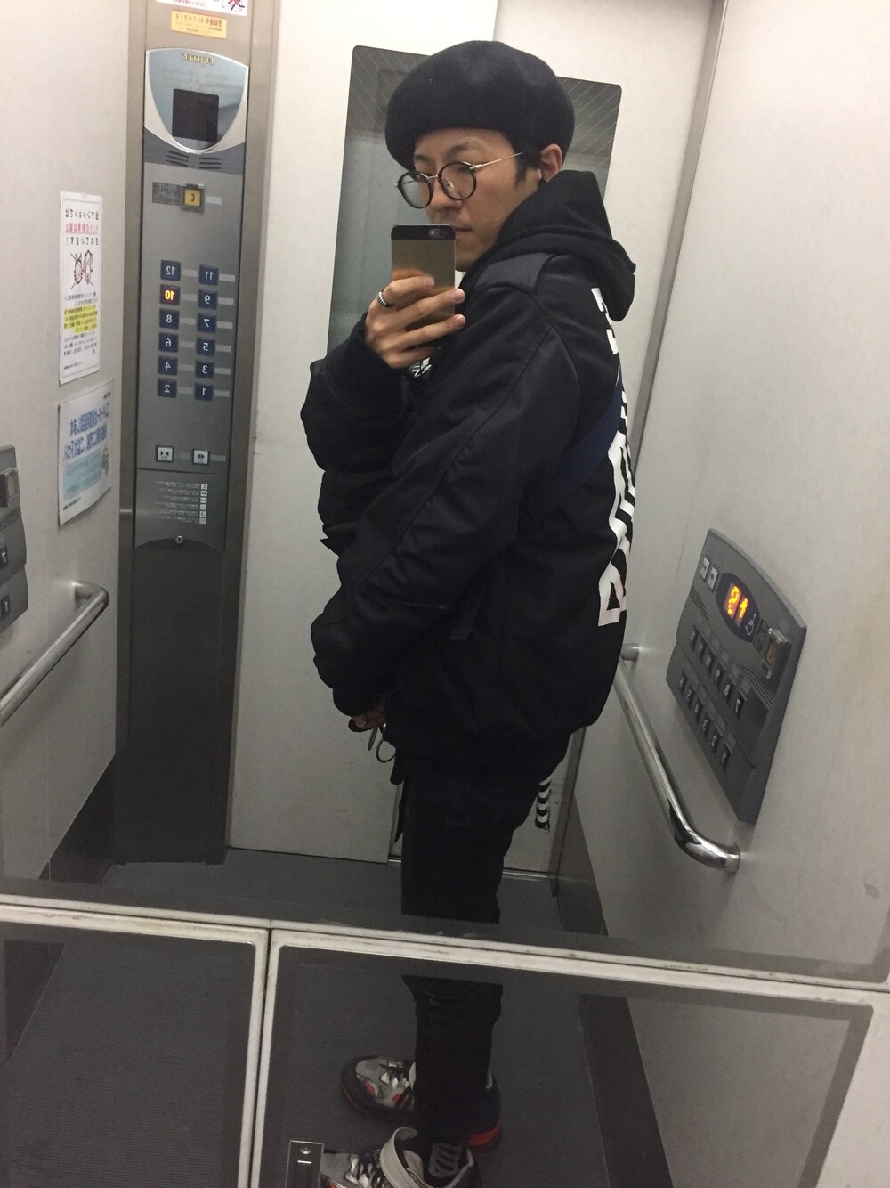 真っ黒です。 ボンバージャケットメインに上は大きめ、パンツはスキニーのスタイルにハマっております。