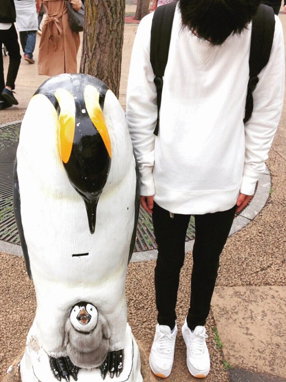 上野動物園のペンギンと。 無地の白いスウェットに白いスニーカーでシンプルに。