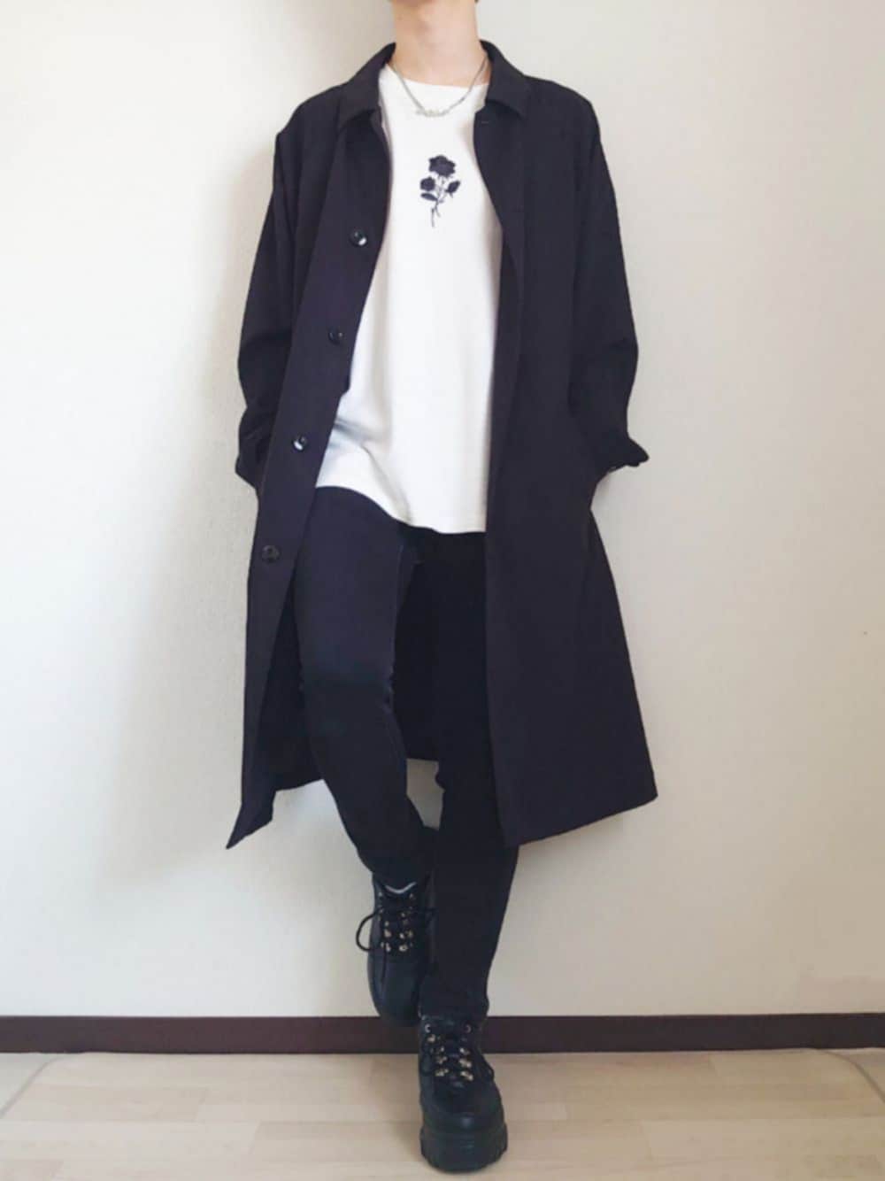 【コーデ日記】 いつも見てくださりありがとうございます 今日は王道モノトーンコーデ ステンカラーコートを使ったコーデです! まだまだ朝晩は冷え込むのでロングコート使えます🤧 インナーのバラTは半袖なのでもう少しあったかくなったら このコーデめっちゃ使えると思います! おそらくこのコーデは今月の個人的に1番お気に入り😂 ぜひ参考にしてみてください! 《お知らせ》 最近Instagramをはじめました! 僕のInstagramではWEARに載せたコーデのまとめ等を投稿しています 僕自身、学生でお金にも限りがあります😥 そんな中で自分が買った服の着回し投稿などもしているので 学生さんには参考になってもらえるかなと思います。 もし良かったらいいねやフォロー等よろしくお願いします🙇♂️