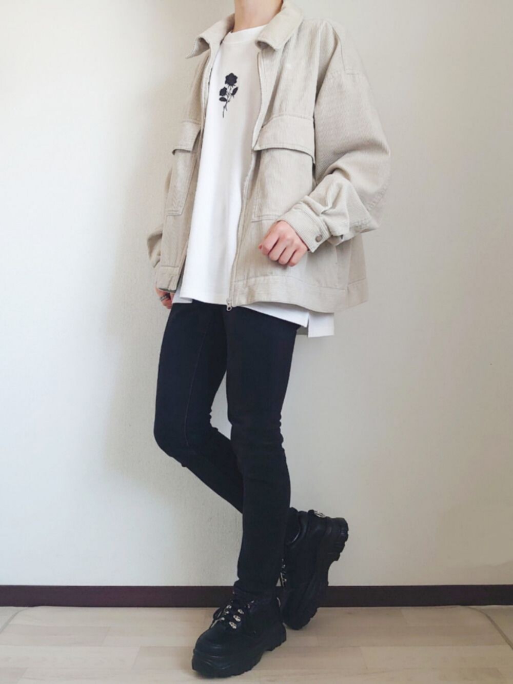 【コーデ日記】 いつも見てくださりありがとうございます 今日は王道コーデ 黒スキニーとコーデュロイジャケットで Vシルエットをつくってアンニュイな雰囲気に👍 モノトーンで万人受けのコーデです! ぜひ参考にしてみてください! 《お知らせ》 最近Instagramをはじめました! 僕のInstagramではWEARに載せたコーデのまとめ等を投稿しています 僕自身、学生でお金にも限りがあります😥 そんな中で自分が買った服の着回し投稿などもしているので 学生さんには参考になってもらえるかなと思います。 もし良かったらいいねやフォロー等よろしくお願いします🙇♂️
