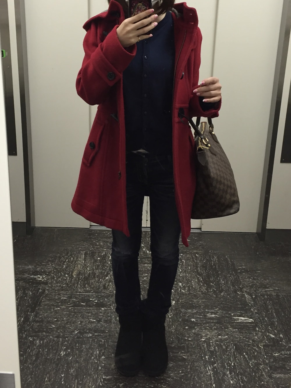 コート/バーバリーブルーレーベル カーディガン/バーバリーブルーレーベル デニム/moussy ムートンブーツ/UGG バッグ/ルイヴィトン