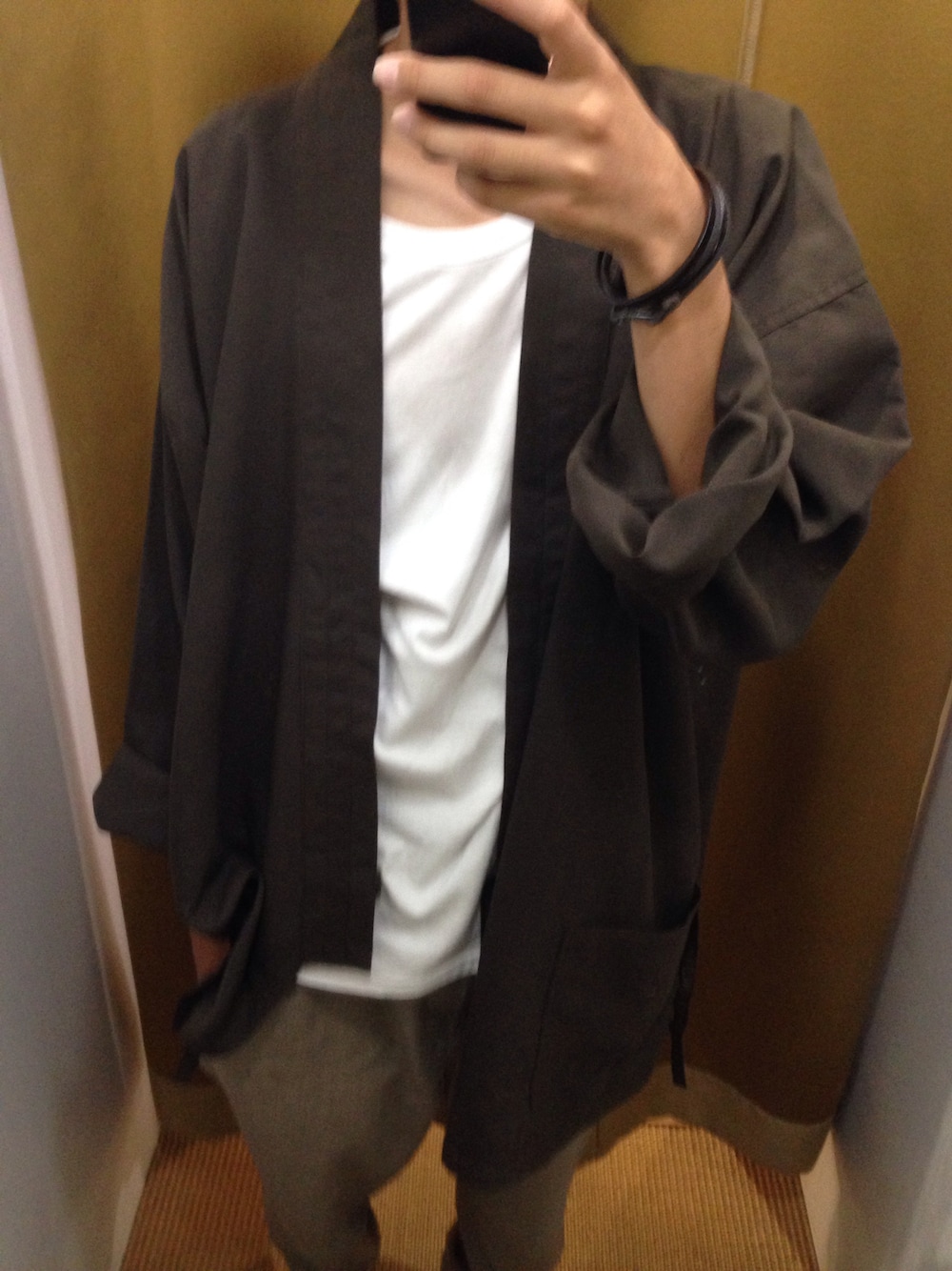 作務衣を着崩しました 上下暖色で色味を揃えて 秋っぽくしました めっちゃぶれてごめんなさい。笑