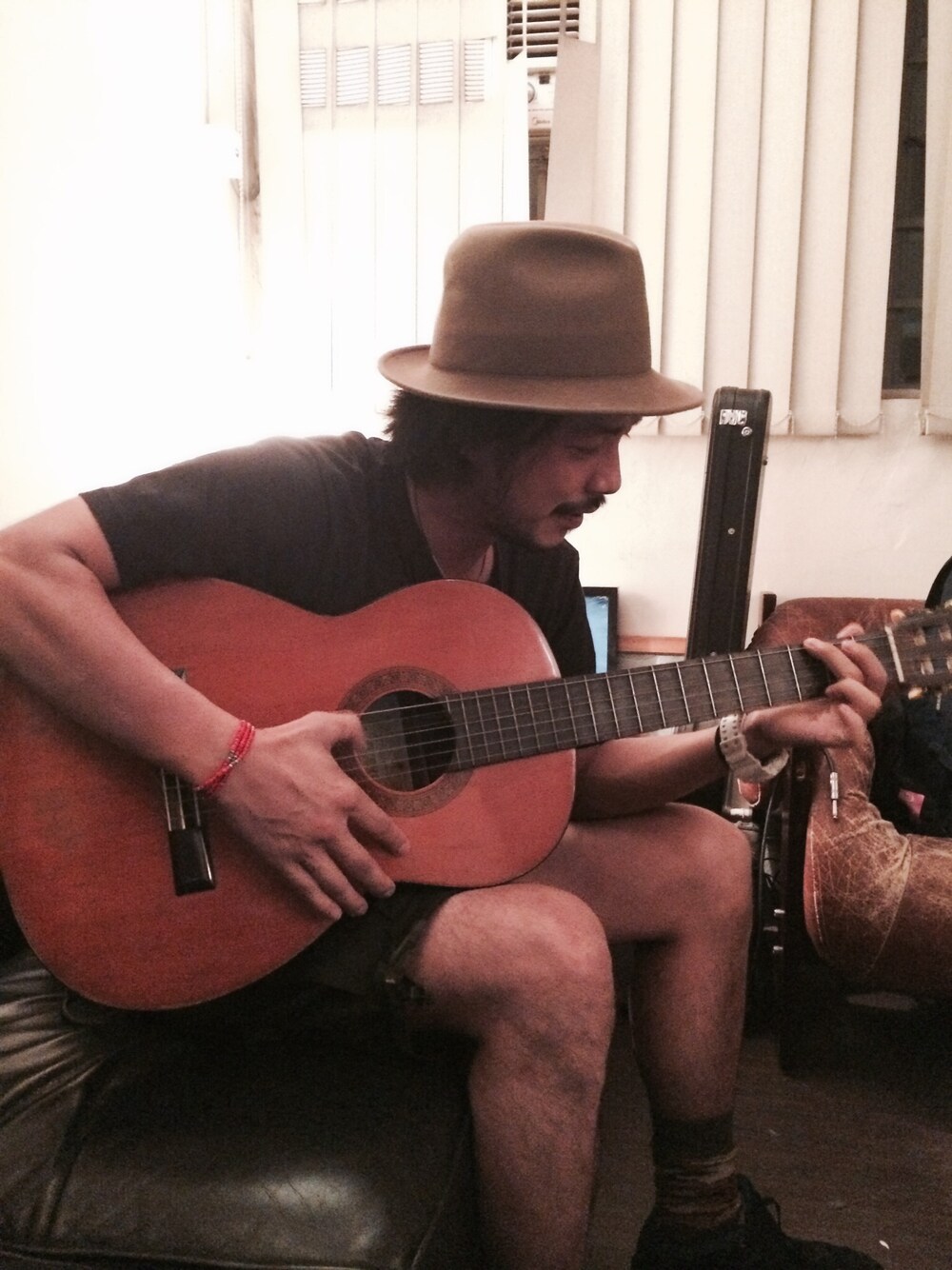 ベージュ系のハット、レッド系のブレスレットを着用したメンズの夏コーディネートの1枚目の写真