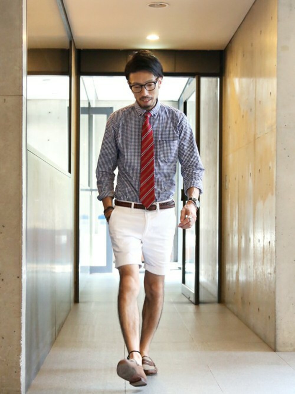 今夏 主役の白ショーツとギンガムチェック。そのまま着るにはカジュアル過ぎるのでタックイン&タイドアップ。 トラッドなネクタイでもこんなスタイリングならピッタリ合います。 シャツ、パンツ共に ストレッチ生地を使用しているので着心地は◎。 色・柄のバリエーションも豊富ですよ☆
