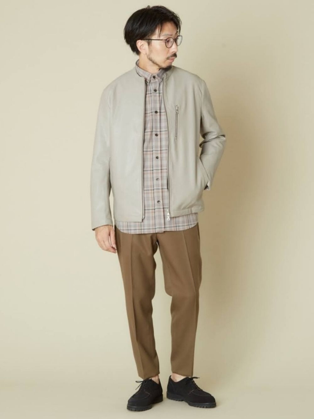 トップにレイヤーした物は、シンプルなデザインをエコレザーに落とし込んだライダースブルゾン。 シャツはウール混紡ですがウォッシャブル。