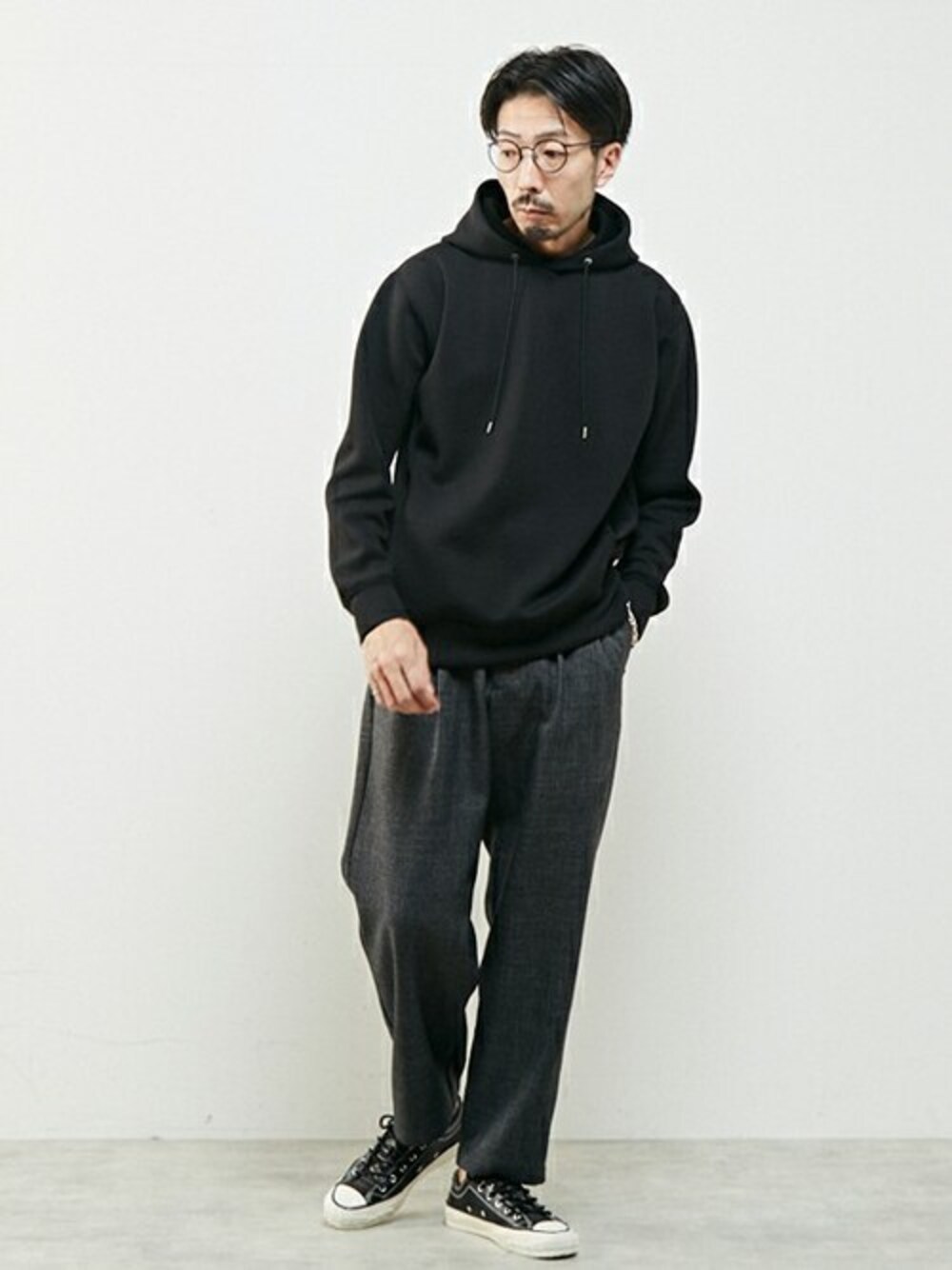 人気ダンボールニットのフーディは軽い着心地でキレイめなので、 これから秋に向けヘビロテ間違いなし。 落ち着きのあるダークカラーでシックで秋らしくまとめるのがおすすめです。