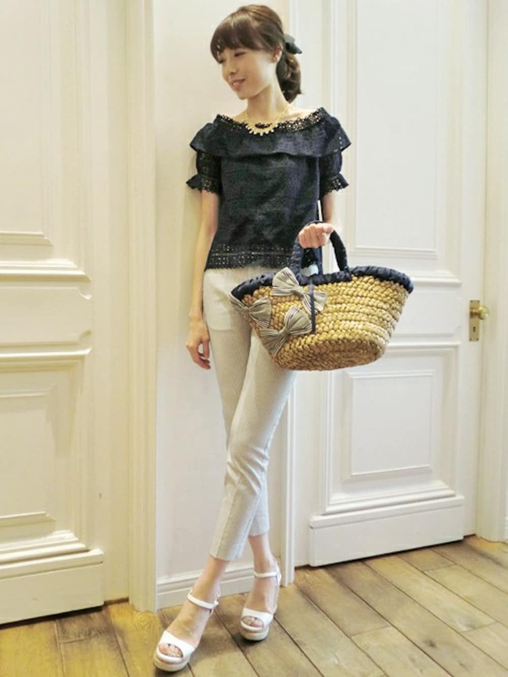 トレンドのホワイトパンツを、ネイビー×ホワイトで爽やかにスタイリング。オフショルダーは肩を落とし過ぎないと着易く、大人っぽくまとまって◎!