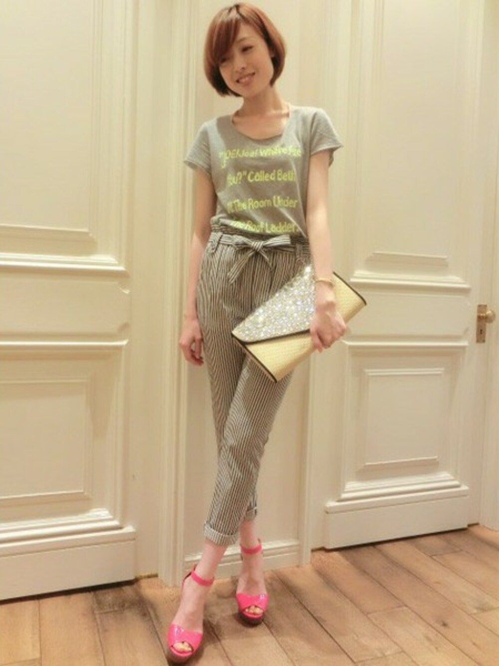 ストライプパンツ×Tシャツのカジュアルなサマーコーディネイト。ウエストインすればラフな印象になりすぎず着こなせます。小物で華やかなアクセントを付けました。