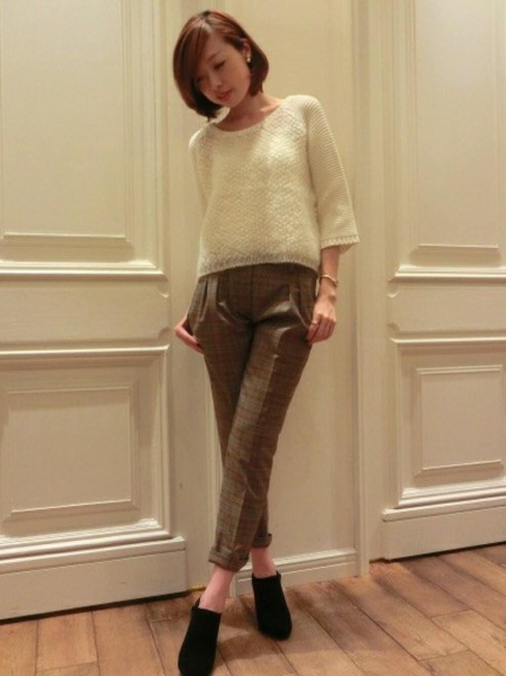 素材感の可愛いループニットをチェックのパンツと合わせた大人スタイル。