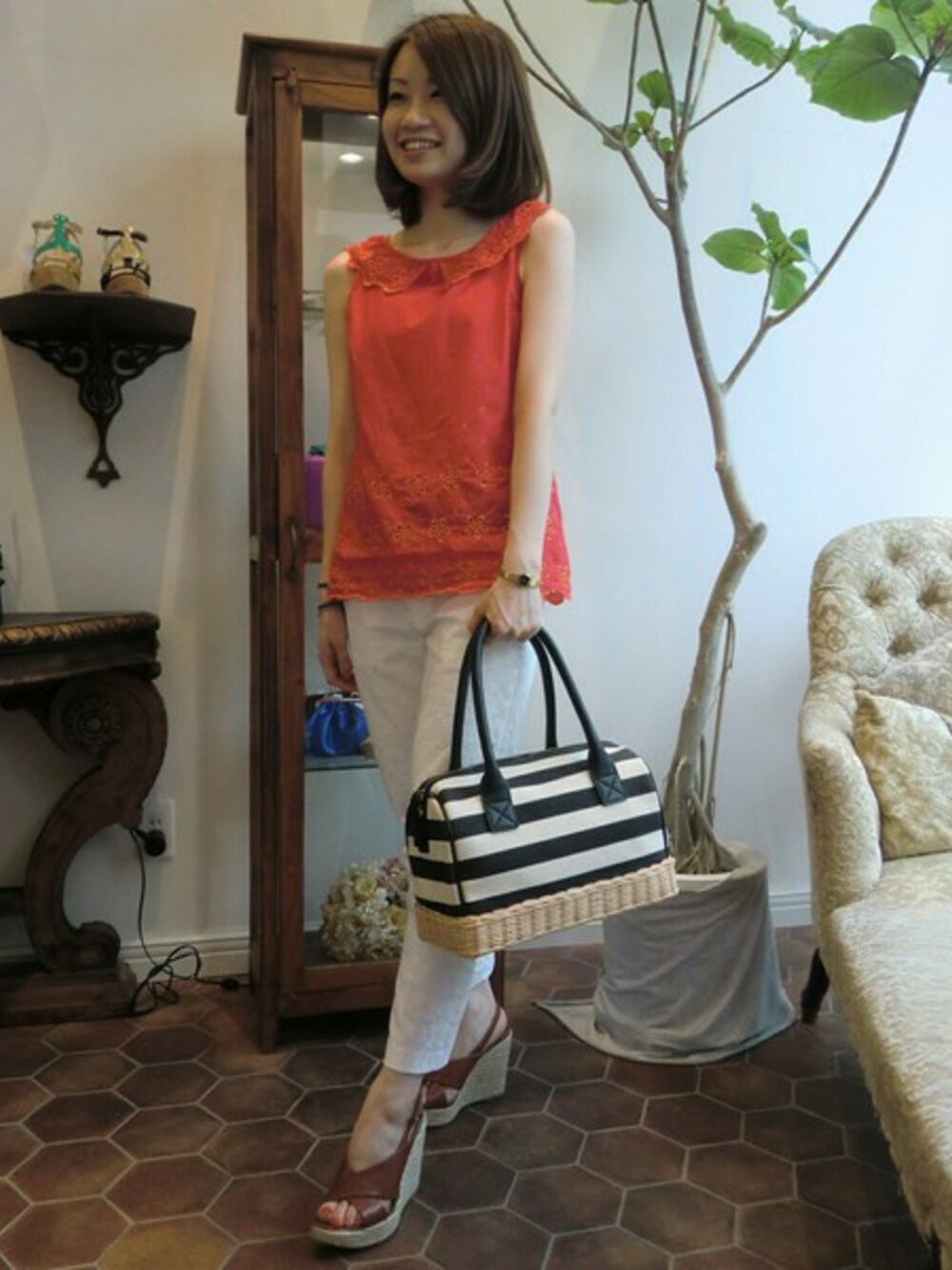 真っ赤な発色のいいブラウスを引き立たせるため、ボトムスはシンプルな白を持ってきました。ジャガード織りの生地のパンツで、シンプルでも華がでるコーディネートにしています。