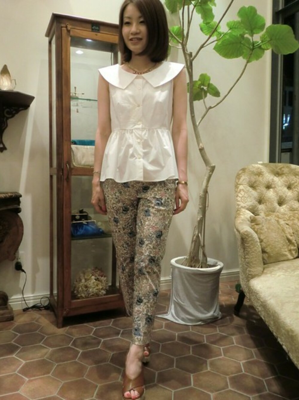 ぺプラム型のブラウスには、相性のいい細身のフラワープリントを合わせて。甘すぎない、大人フェミニンを意識しています。