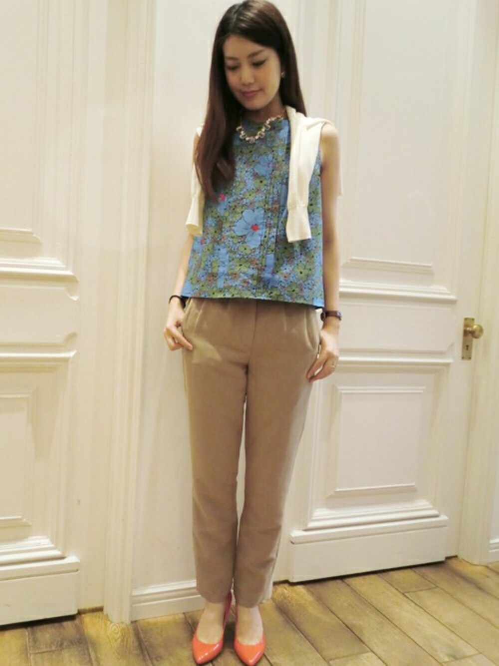 シンプルなタンク型のフラワープリントには、こんな美シルエットのパンツで大人コーデがぴったり☆どんなスタイリングにも映えるビジューのネックレスはスタッフみんなお気に入りのかぶりアイテム!