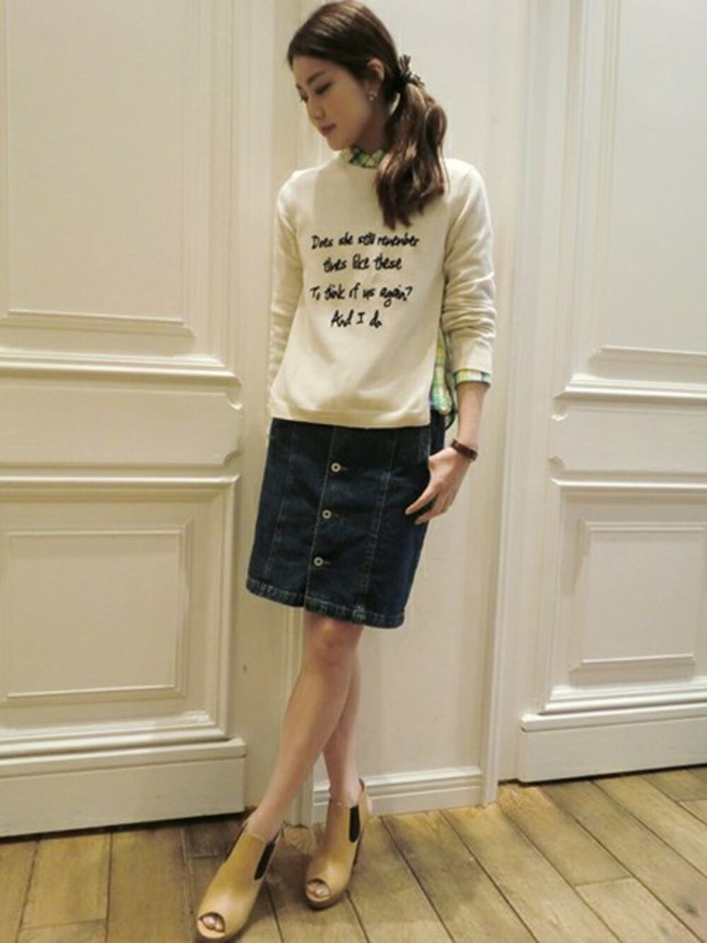 カジュアルスタイルも、スカートをタイト目にするだけで、大人っぽく。サイドが大きく開いたニットのから見せる、オリジナルチェック柄のシャツがポイント☆