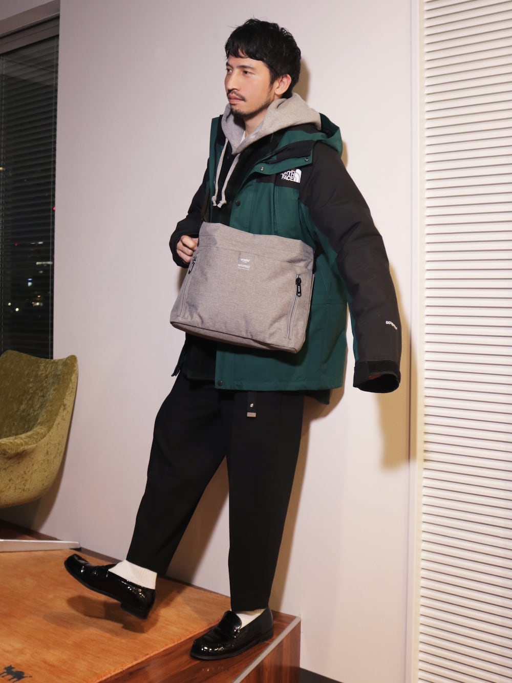 今日は寒いのでCPOシャツをマウンテンパーカーにレイヤード。カジュアルになり過ぎないようにエナメルローファーでまとめています。パーカーと同色の大きめサコッシュがポイント。