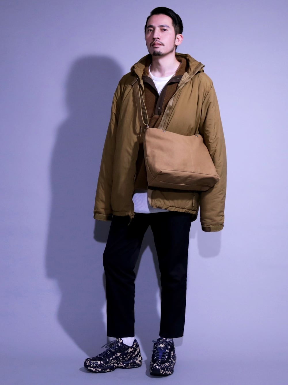 NIKE×C.EのAIRMAX95のカラーに合わせて、ネイビーとベージュでまとめたコーデです。 anelloのキャンバスショルダーは、とてもシンプルなデザインなのに、実は10個もポケットがあって機能的な仕様。カジュアルでクリーンなコーデに合わせやすいです。