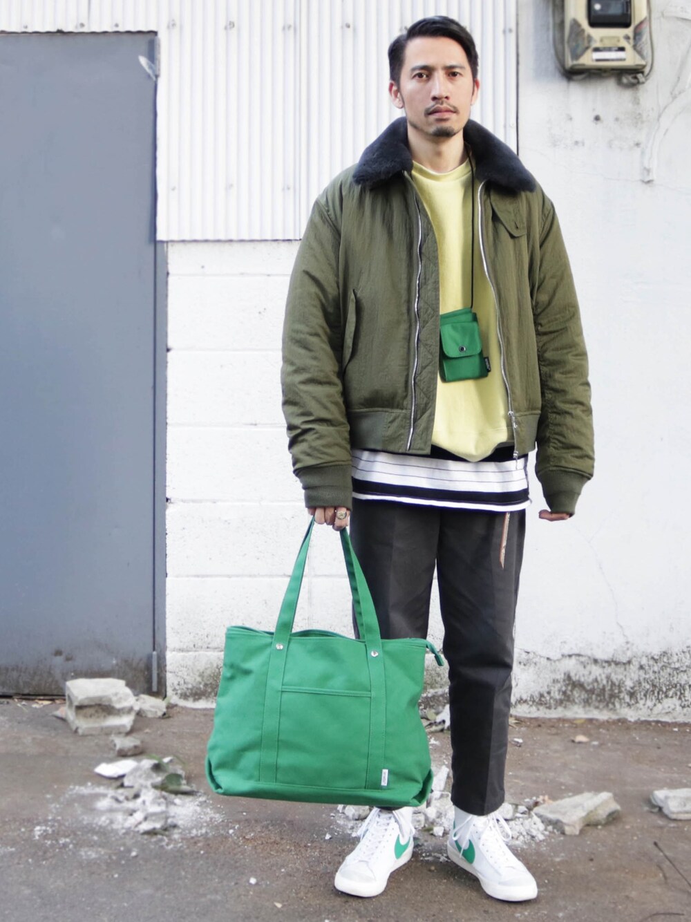 グリーン系のカラーリングでまとめたコーディネート。NIKEのBLAZERとanelloの10ポケットトートバッグのヴィンテージグリーンがポイントです。