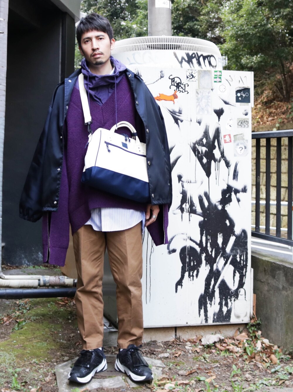 カスタマイズしたNIKEのM2K TEKNOを中心にスタイリング。UNUSEDのアノラックとオーバーサイズニットを同色レイヤード。H BEAUTY&YOUTHのコーチジャケットとanelloのボストンショルダーをカラーリンクさせました。