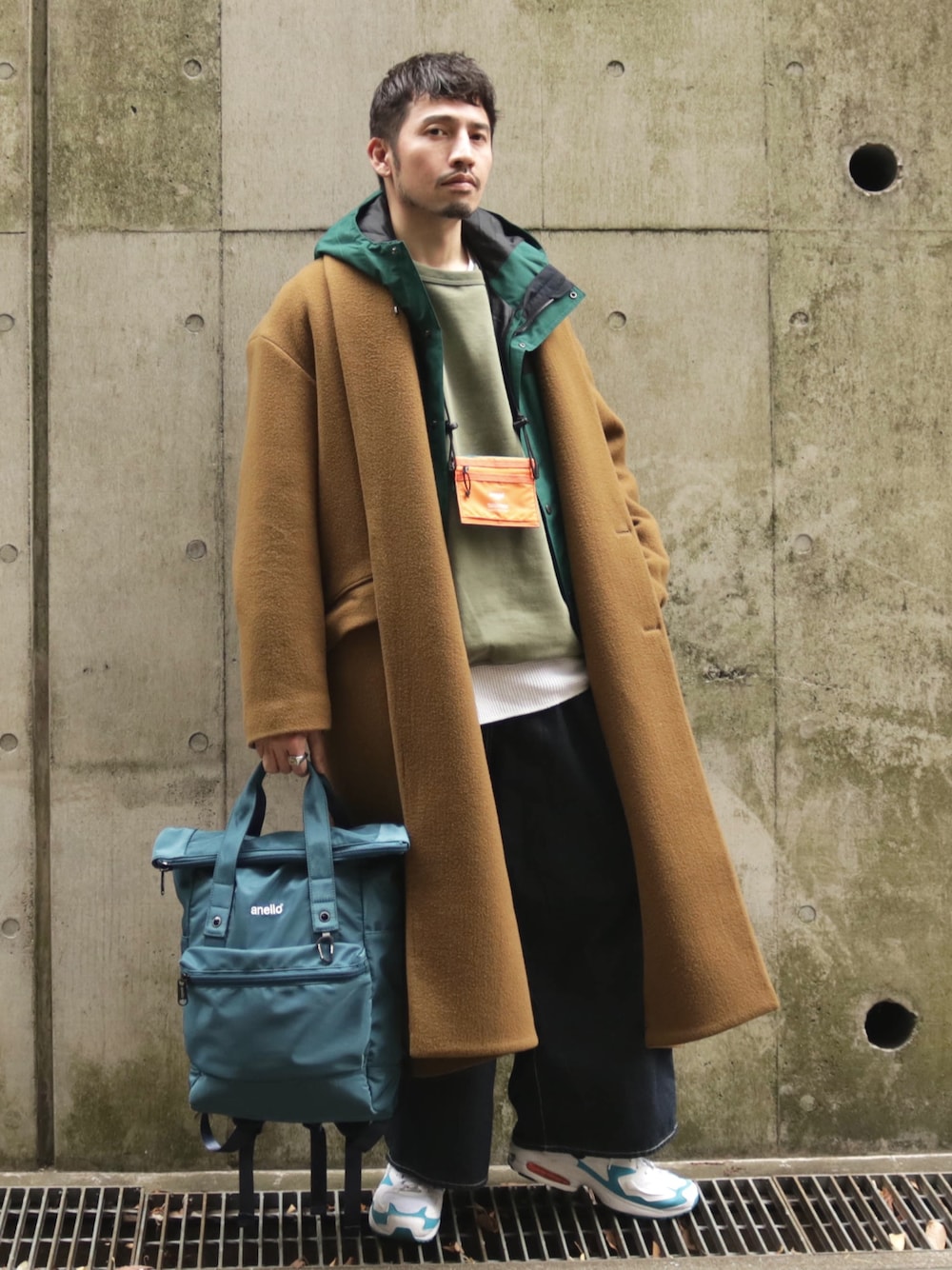 今日は寒くなるのでロングコートを中心にコーディネート。中はTHE NORTH FACEのマウンテンパーカーで、アウターレイヤード。NIKEのAIRMAX 2 LIGHTとanelloのバックパック、ネックウォレットをカラーリンクさせています。