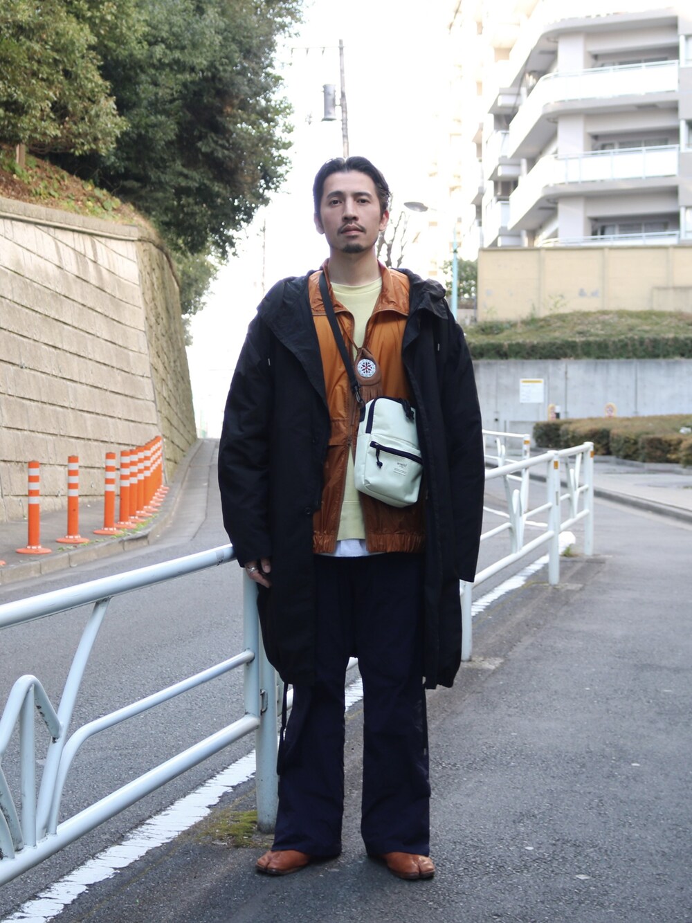 アイボリー、イエロー~ブラウン系の同系色を、ブラックとネイビーで締めたコーディネート。 anelloの新作のミニショルダーは、縦長のシルエットと絶妙なアイボリーカラーがポイントです。