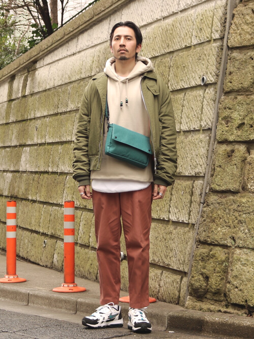 春らしいやわらかいカラーでコーディネートしました。NIKEのAIRMAX 96ⅱxxと、anelloのショルダーバッグは同系色でコーディネートして、まとまりのある感じに仕上げました。