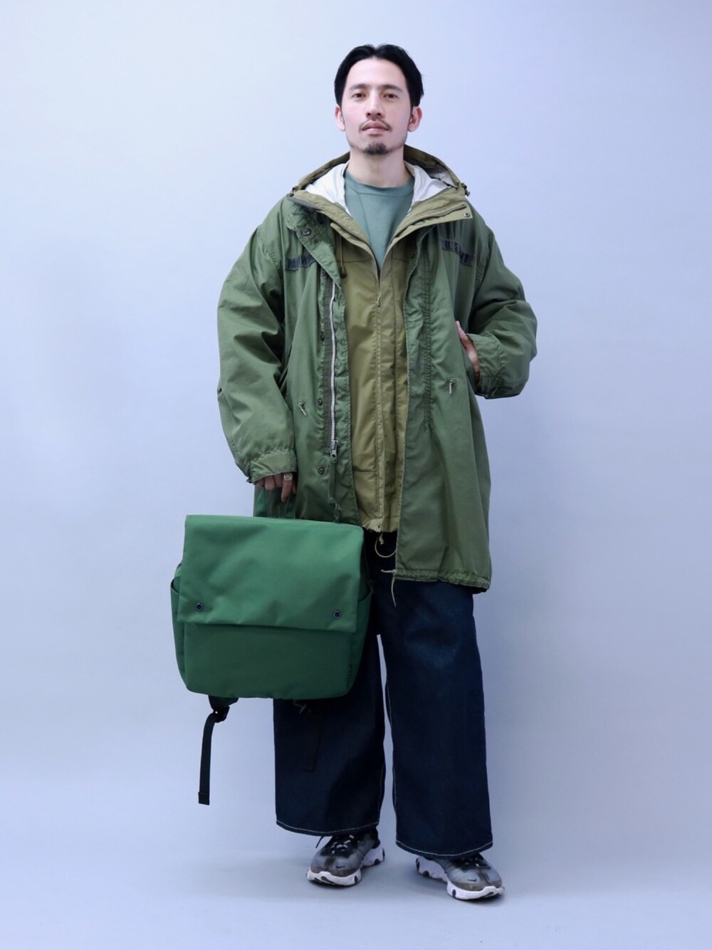 カーキ系のカラーをレイヤードした、春らしいコーディネートにしてみました。 anelloのフラップリュックは、シンプルで合わせやすく、使い勝手バツグンです。