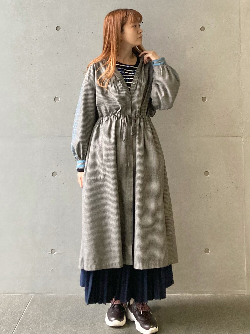 今月発売されたワンピースをワイドパンツと合わせたレイヤードスタイルで着てみました。 ワンピースは前開きなので春先の羽織にもお使いいただけます。 さりげない刺繍が可愛い1枚です。 春はこちらのスタイルで、今はコートのインナーに是非。