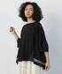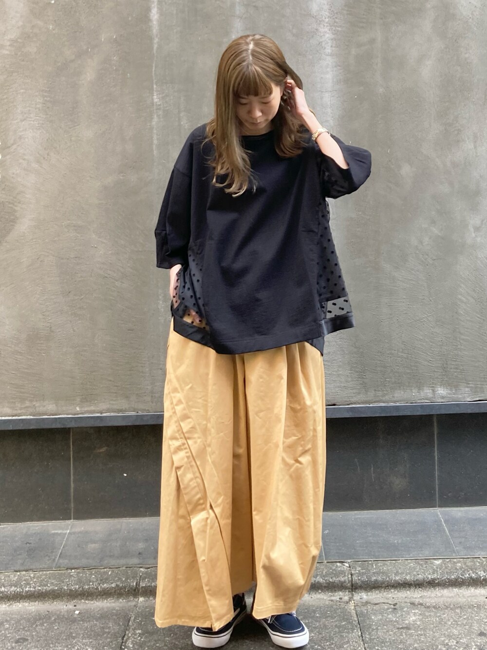 立体感が特徴的なフラボアらしいデザインパンツは、実際履くと独特なシルエットのスカートのようにも見えます。 着用しているイエローベージュは他にはなかなか無いお色で、春夏感も出してくれます。 トップスを黒にすることで大人っぽい印象に。 後ろ身頃にドットプリントの入ったチュールがドッキングされています。どんなボトムとも合わせやすいのでこの夏オススメの1枚です。
